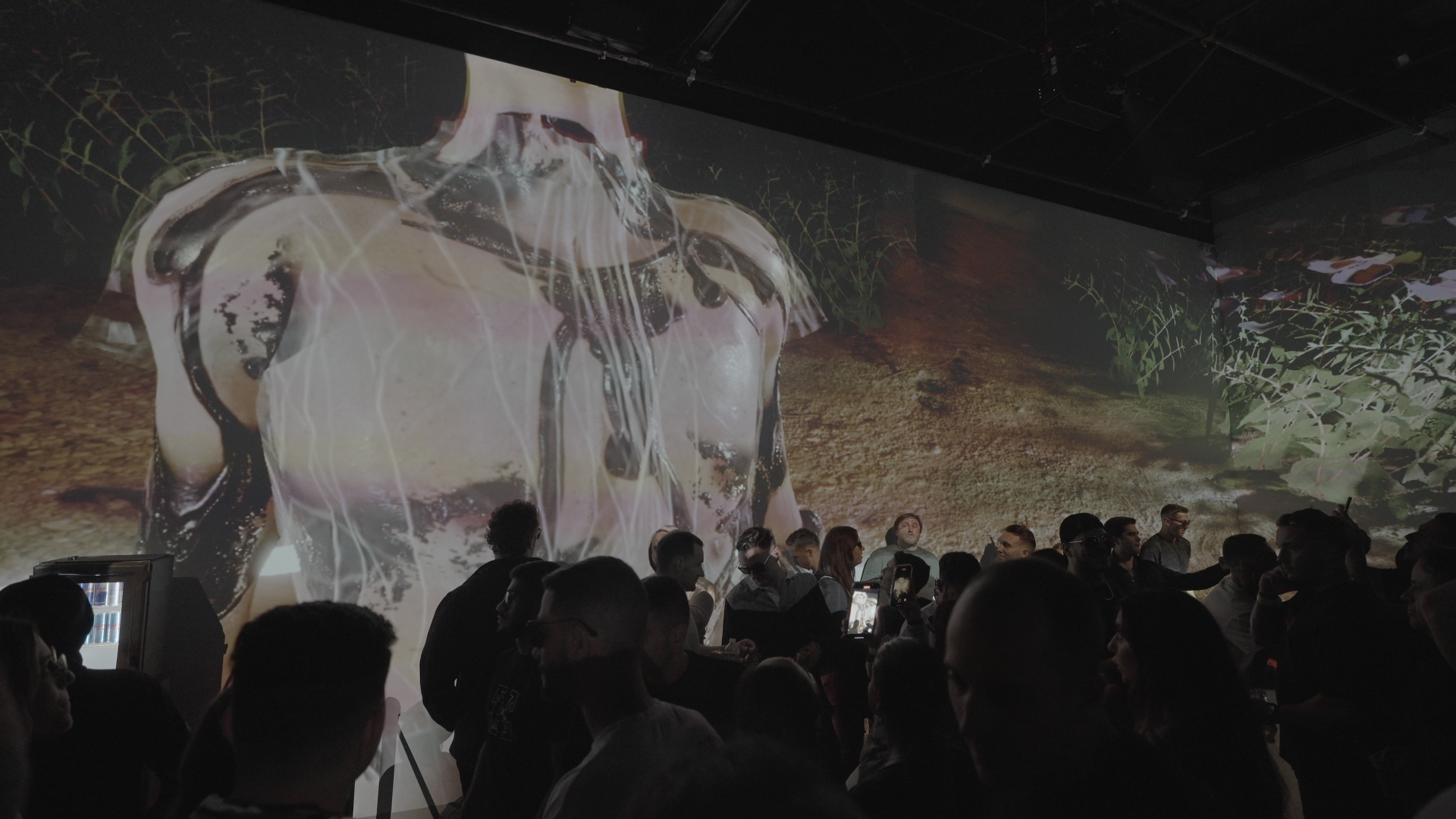 During a DJ set by Dixon in April of 2023, Mélanie Courtinat performed live by playing a video game she created in collaboration with Transmoderna. In a surprising twist in the middle of the night, midway through his set, Dixon paused his music, and the walls of Art District Brooklyn illuminated with interactive landscapes. With a controller in hand, Mélanie navigated several virtual environments, bringing them to life in real-time for the audience.
